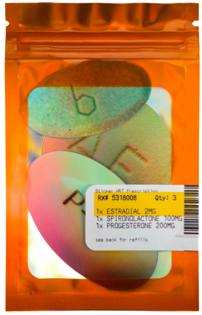 Stickers I made of my HRT regimen. Basically an intrusive thought that I really wanted to make into a product. I tried to sell them for a bit but nobody was really buying, so now I just have a ton of these things on hand. Hit me up if you want one.